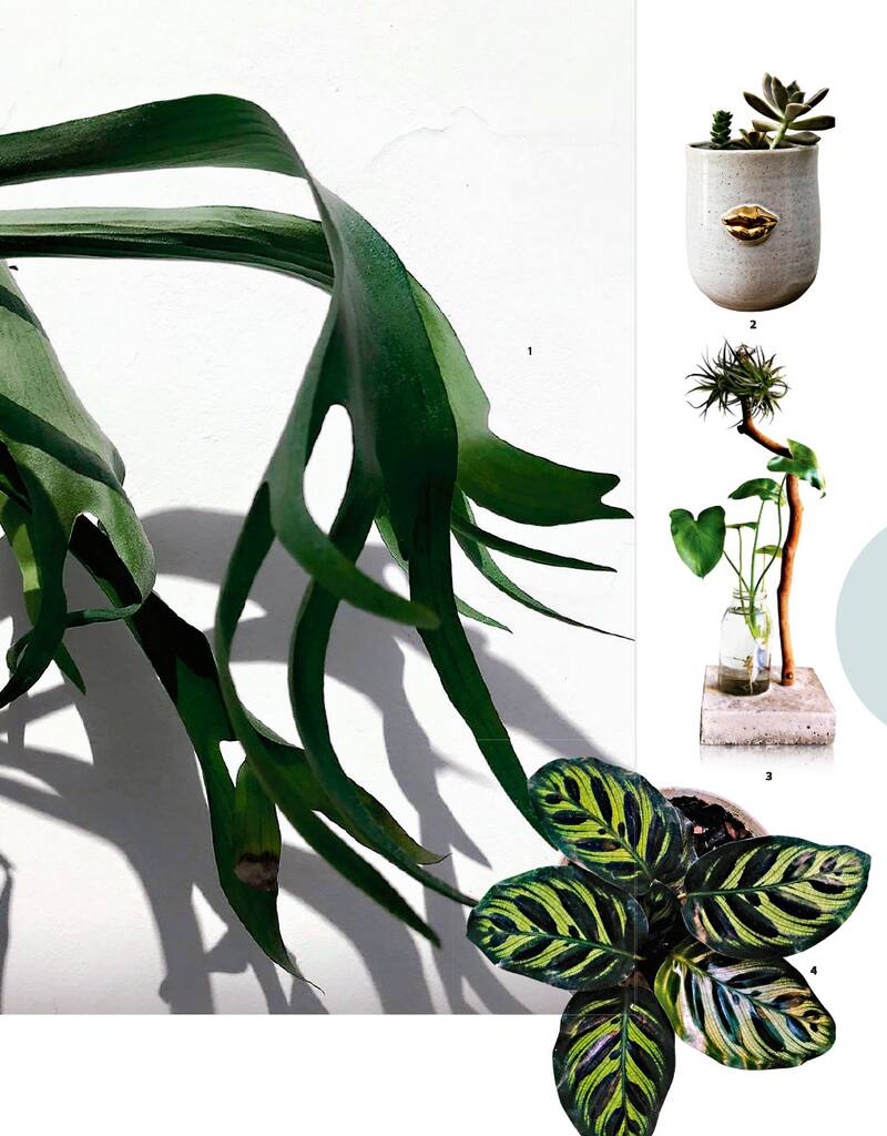 1. Cuerno de alce, 1 m de alto, incluye macetero, $45.000 (Concepto Sombra) 2. agoda y graptopetalum paraguayense, en maceta de cerámica gres esmaltada, con aplicación de oro, 13 x 13 cm, $28.000 (Taller Andrea Gacitúa Cerámica) 3. Tillandsia y filodendro paraguayo, en maceta Lignum, $34.990 (Cementa Verde) 4. Calathea makoyana, $20.000 (Vive Vivero).