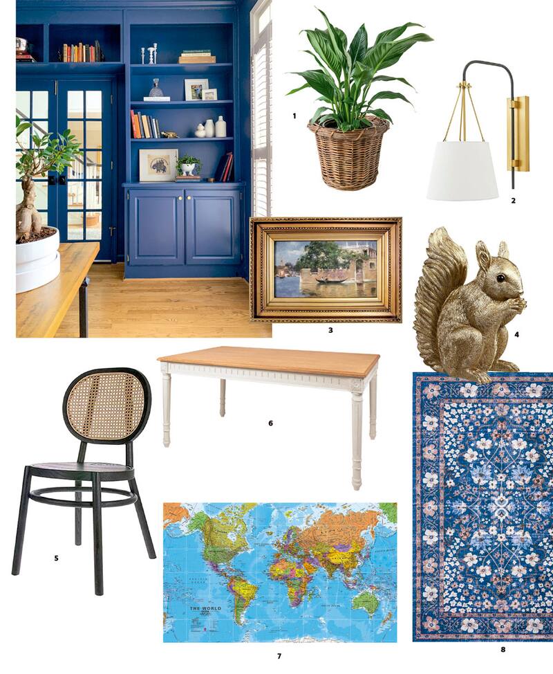 1. Planta espatifilo grande, $20.000; canasto mimbre, $12.000 (@_plante) 2. Lámpara muro Rovinj, $119.800 (@domdesign.cl) 3. “Paseo en góndola en Venecia”, óleo sobre madera, con marco, vintage, $160.000 (@candildelosrecuerdos) 4. Ardilla alcancía, $40.000 (petrycor.cl) 5. Silla madera y enjuncado, $160.990 (@domdesign.cl) 6. Mesa comedor Esteban, Sarah Miller, 75 x 90 x 150 cm, $459.990 (paris.cl) 7. Mural IXXI The World, small, $69.900 (@kenza_design_chile) 8. Jardines franceses: El estilo es parte de la Colección Palais de alfombras, combinadas con motivos florales y tradicionales que siguen el diseño de los famosos jardines franceses, además de divertidos patrones inspirados en las ilustraciones de Anna Bond. Son piezas atrevidas, modernas y coloridas que dan personalidad a los espacios. Alfombra Palais Navy Rifle, Paper Co x Loloi, 1.53 x 2.29 cm, $375.000 (perleperle.cl).