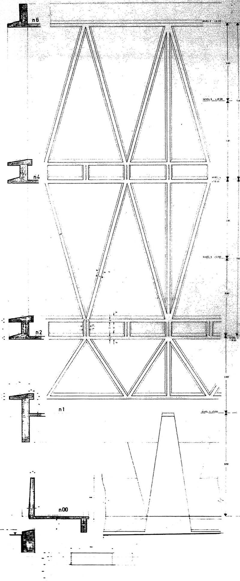 Este último volumen finalmente no fue construido ya que todo el programa requerido pudo ser contenido en el volumen principal. Además, uno de los principales estudios de Guiñerman desarrollados en el proyecto de título fue la prefabricación de piezas en hormigón usando pre y postensado, las cuales finalmente fueron modificadas y desarrolladas en obra de manera convencional. Luego de titularse, Guiñerman trabaja entre 1965 y 1971 desarrollando el proyecto como arquitecto de la Dirección de Arquitectura del MOP, es en ese proceso en el cual la precariedad económica del país y el bajo desarrollo tecnológico del hormigón armado en Chile hacen que el proyecto original se adecue a la realidad constructiva del momento. El desarrollo de la viga reticulada de las fachadas principales se mantiene suspendido sobre pilares. Dos núcleos interiores rígidos y plantas libres, conjuntamente con la expresión final del hormigón armado con terminación a la vista, mantienen continuidad con lo desarrollado en el proyecto de título; es decir, Guiñerman logra mantener la ‘tectónica’ de la propuesta original donde las fachadas principales se constituyen como la exteriorización de un esqueleto resistente.