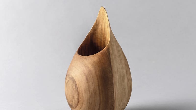 Es una gota de agua que se volvió coigüe. Perfecta en la suavidad de sus curvas, en las proporciones de volumen y vacío que realzan la belleza de las vetas de la madera.