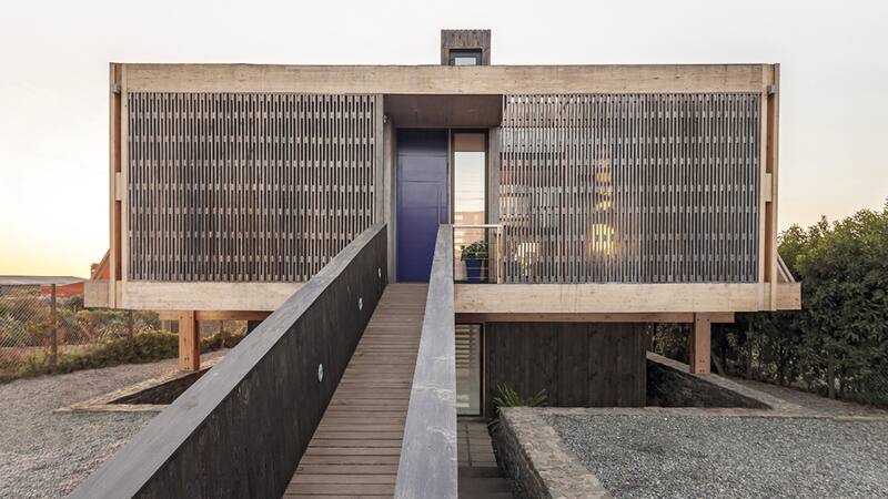 La estructura se plantea como un sistema ensamblado en madera laminada, despegado del cuerpo volumétrico, compuesto por el cruce de cuatro vigas y cuatro pilares dobles, posados puntualmente sobre una contención perimetral de piedra como soporte que resguarda y establece el nivel inferior de la casa. La madera es utilizada como material único, tanto por su economía como por su perdurabilidad en el tiempo dentro de ambientes salinos.
