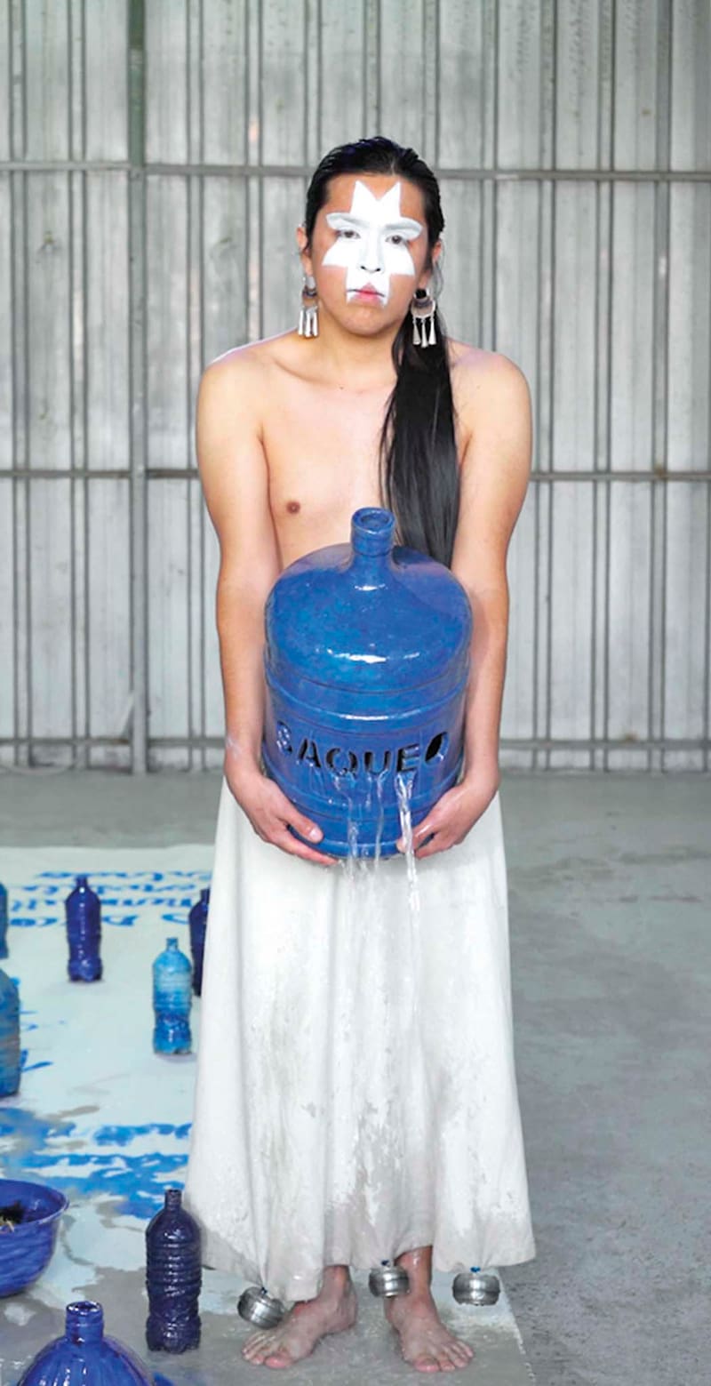 Es lo que significa Ko ta mapungey ka y lo que el artista Sebastián Calfuqueo trabajó el 2020 en un cuerpo de obra que reflexiona acerca del amparo que existe en este país al saqueo del agua, acuñado en la Constitución del 80. Por medio de piezas de cerámicas esmaltadas azules con forma de bidones y fuentes de agua, el artista plantea que el agua también es un territorio en disputa, donde la tierra no sirve si no hay agua. “La obra busca poner en cuestión los vínculos históricos del agua y el pueblo mapuche en relación con el extractivismo neoliberal presente en Chile y su modelo privatizador del agua”, cuenta Sebastián.