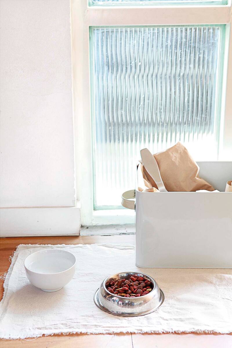 El más pequeño y peludo habitante de la casa también puede tener un rincón bonito y armónico, acorde al resto de la casa. No tiene por qué tener el plato morado, la mantita con pintas de colores y la cucha azul. Para que sume a la casa y no sea un foco disruptor, solo necesitas delimitar su zona; por ejemplo, con una tela sin diseños y usando una sola paleta de colores, como en este caso crudos, para todos sus accesorios, camita incluida.