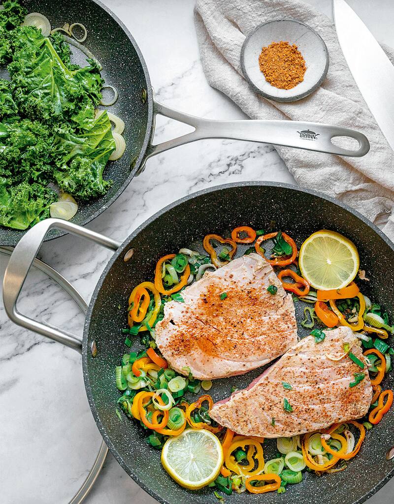 - Atún. Calentar el sartén a alta temperatura, agregar mantequilla y con el fuego al máximo poner el atún fijándose que por el costado no se cocine completo, debe quedar rojo en el centro. Dar vuelta y dorar por el otro lado, agregar sal, pimienta y merkén, poner los cebollines y pimentones alrededor del atún para que vuelvan a tomar temperatura y llevar el sartén directo a la mesa.