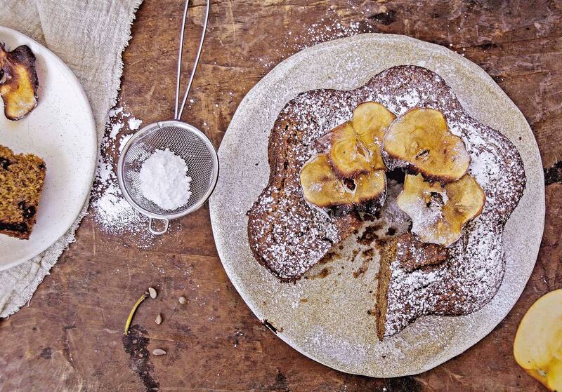 • Encima poner rodajas de manzana: cortar las manzanas finas, bañarlas en una mezcla de agua con azúcar de coco, ponerlas en papel mantequilla sobre la lata del horno y hornear hasta que estén crujientes.