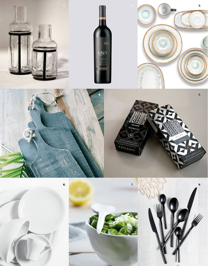 Direcciones: Blackburn, www.blackburn.cl; Mios Home, @mios_home; Ventisquero, www.ewine.cl, www.tienda.elmundodelvino.cl, www.lacav.cl; Iregua, www.iregua.cl; Galpón de Diseño, @galpondediseno; Coquinaria, www.coquinaria.com; Adriana Larraín Ceramics, @adrianalarrainceramics; Brann, www.brann.cl; Epaté, @epate.cl; Dulcería San Estanislao, @dulceriasanestanislao; Kitchen Line, @kitchenline_cl.
