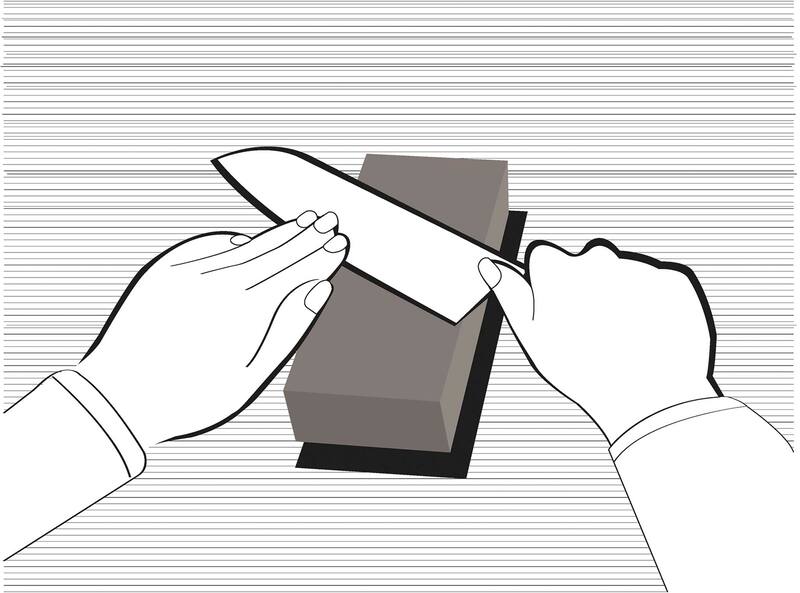 “Antes de afilar sumerjo la piedra en agua fría por 30 minutos. Luego la saco y la pongo vertical a mí, sobre un paño húmedo para evitar que se mueva. Apoyo el filo del cuchillo horizontalmente y levantado a unos 15°. Con una mano el mango, la otra manteniendo la hoja sobre la piedra. Y comienzo un movimiento de arriba hacia abajo de la piedra. Partiendo por la punta y avanzando por todo el filo. Así nos movemos por la piedra hasta lograr cubrirlo. Siempre por el mismo lado y agregando agua cuando vean que se seca”.