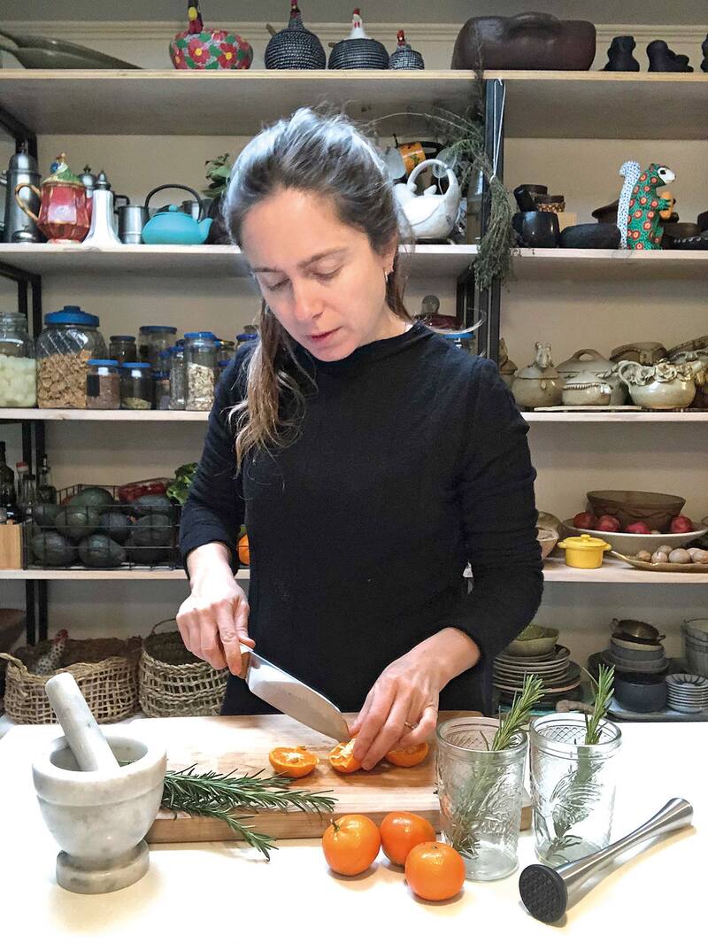 • En una jarra grande poner cinco o seis mandarinas lavadas, despepadas y cortadas en trozos. Añadir la pasta de romero, revolver y aplastar hasta soltar su jugo y el sabor de su cáscara.