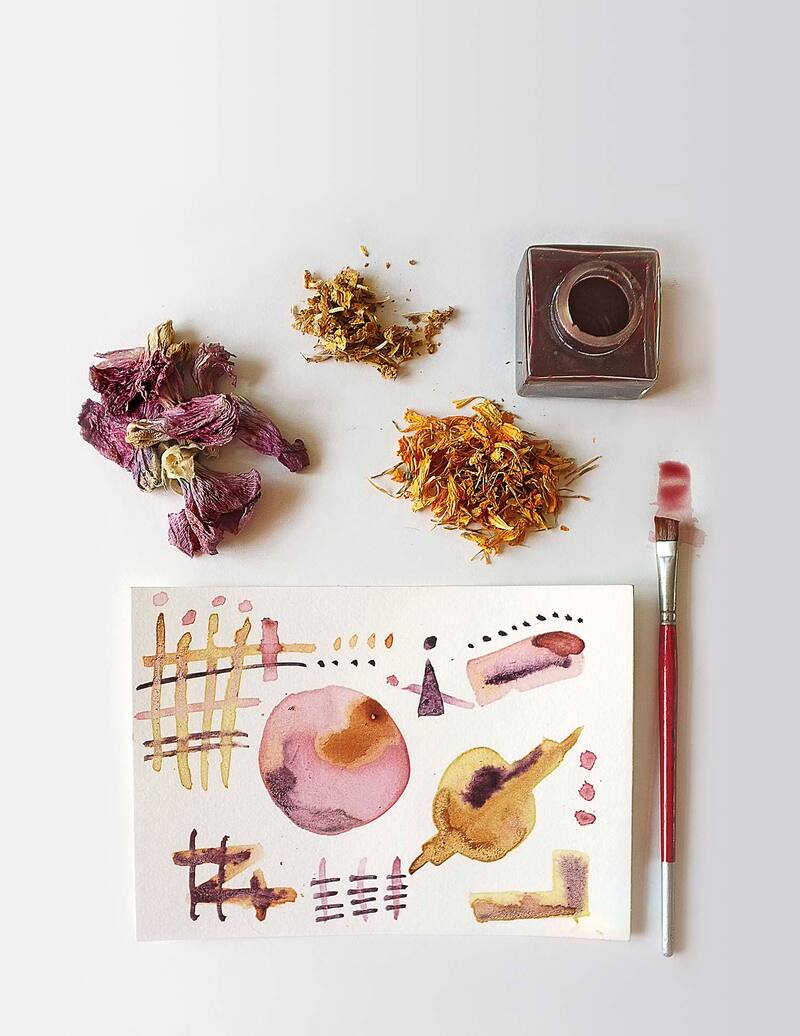 Cuenta que para hacer los colores con plantas en tintas hidrosolubles, ella las planta, las recolecta y las guarda. “Las recojo cuando están marchitas principalmente y hago un pequeño cocimiento. Después vendrán estabilizadores de colores como sales, modificadores ácidos (limón, vinagres), taninos (cáscaras de nogal) y distintas gomas para fijar. Estas pueden ser para papel, textil e incluso madera, y también se puede considerar algún conservante natural antibacterial”, cuenta.