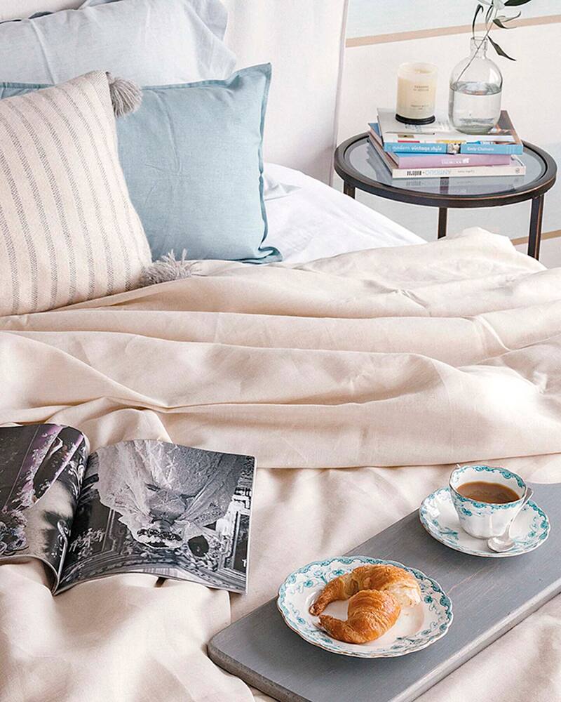 A la gran pregunta ¿muchas o pocas almohadas y cojines? Paz Gaete responde: "Lo ideal son dos almohadas del tamaño que corresponde a tu cama (mucha gente que tiene cama king y superking usa la almohada de 50 x 70 y tienen que usar la del 50 x 90) más dos del mismo tamaño y arriba dos cojines". Los cubreplumones de La Blanquería son lisos; en lino solo trabaja con neutros y en algodón tiene 14 colores. El algodón es orgánico y no necesita plancharse. "Nuestros detalles van en las pieceras y los cojines, que pueden tener estampados, pero muy sutiles".