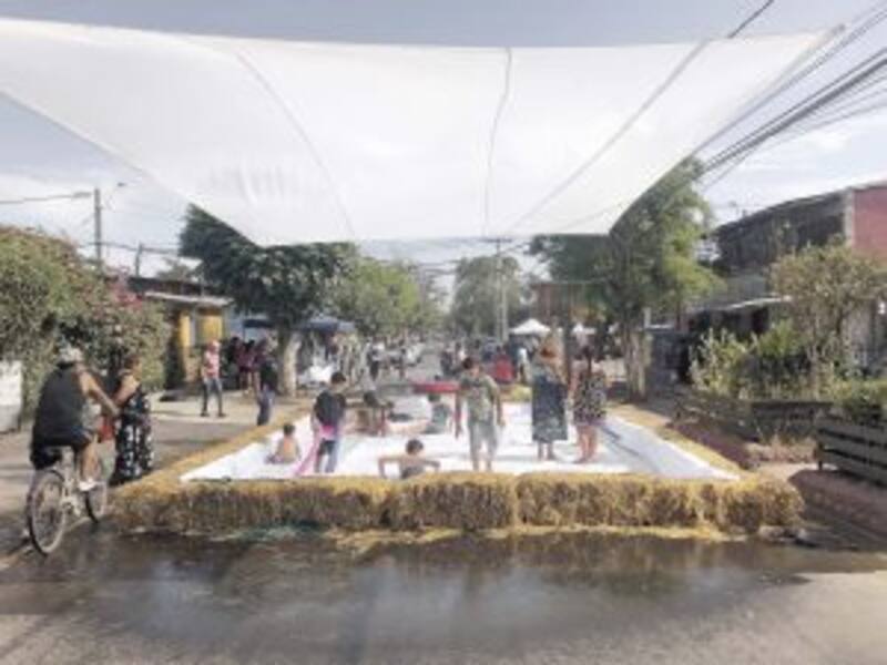 El proyecto "Lluvia en tu calle" fue una colaboración junto a Ciudad Emergente en el contexto del evento de integración para la población migrante llamado "La mesa latina", realizado en Estación Central, para el que desarrollamos una estructura efímera, compuesta por un kit desplegable de techo, riego y receptáculo de acumulación, que fuese capaz de activar la vía pública en torno al uso recreativo del agua y su aprovechamiento para regar áreas con vegetación cercanas. La instalación fue montada en pleno verano, por lo que muchas personas, especialmente niños, se acercaron a la estructura para jugar y deslizarse bajo el agua. Finalmente evacuamos toda el agua hacia unos pequeños jardines que había en la vereda del lugar.
