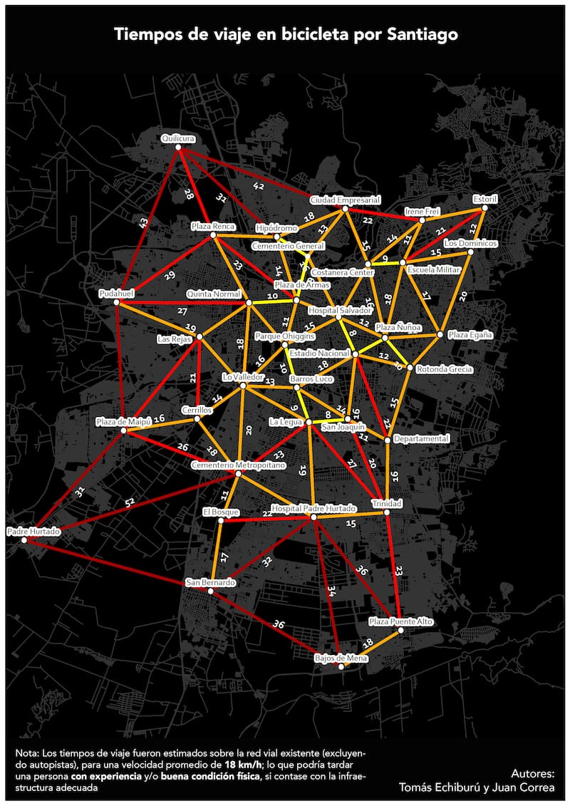 Juan Correa y Tomás Echiburú determinaron una serie de puntos de interés en la ciudad y luego estimaron los tiempos de viaje en bicicleta (usando rutas reales) entre dichos puntos, considerando dos opciones: velocidad de novato (12 km/h) y experto (18 km/h).