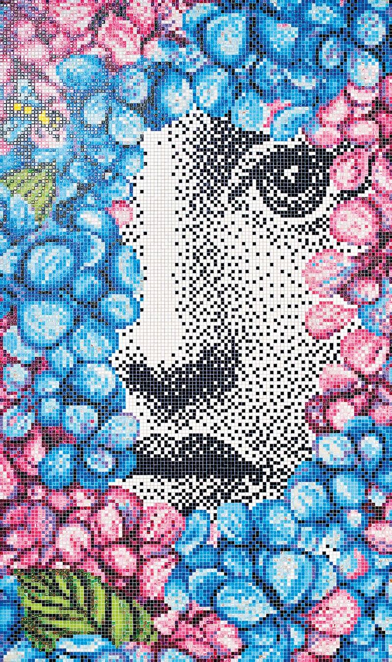 Lina Cavalieri, la soprano superstar de inicios del s. XX, aparece aquí con un aire inocente, semiescondida tras los delicados pétalos rosa y celeste que la cubren. Parece una deidad clásica de la primavera. Casi, casi se puede oler el perfume de las hortensias ricamente plasmadas con 24 tonalidades de téseras.
