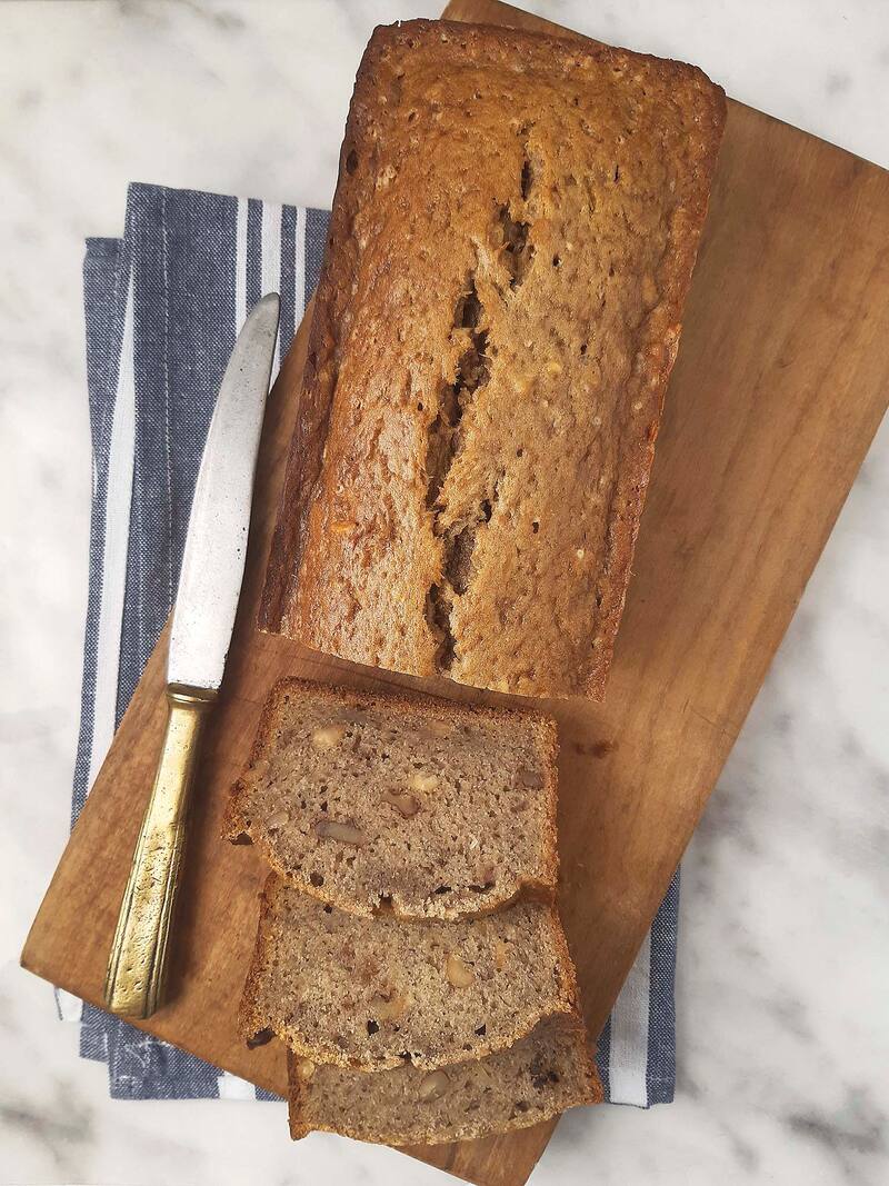 Precalentar el horno a 180 °C. Engrasar un molde rectangular. Mezclar por un lado harina, azúcar, bicarbonato de sodio, canela y sal. Por otro, plátanos, yogur, huevos, mantequilla, aceite y vainilla. Integrar los ingredientes húmedos en los ingredientes secos. Añadir las nueces, revolver hasta homogeneizar. Pasar al molde y hornear por 50 min. o hasta que al insertar un palillo de madera en el centro salga limpio. Enfriar por 30 min. y desmoldar.