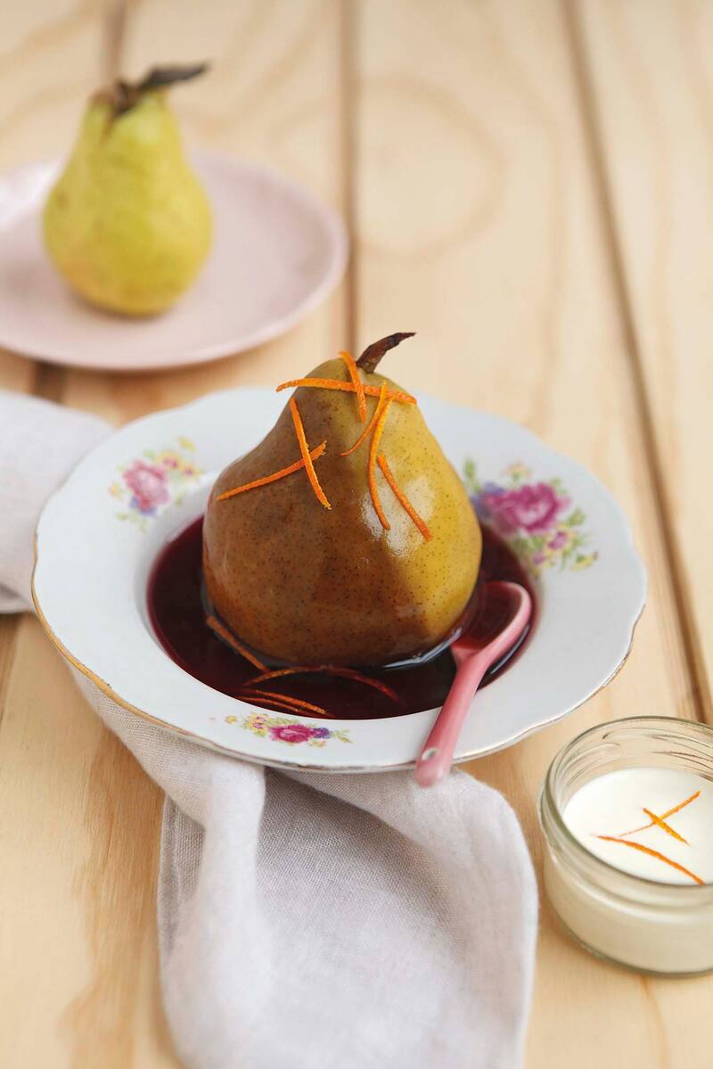 Claro que sí. Los mismos ingredientes pero con peras peladas. Por 25 minutos para que queden más firmes. Luego reducir el vino (que quedará más líquido) hasta el punto deseado.