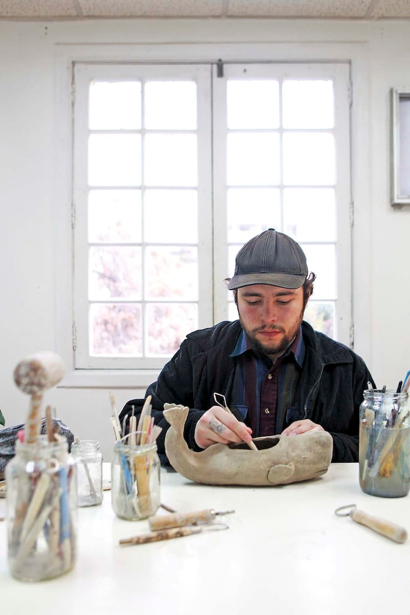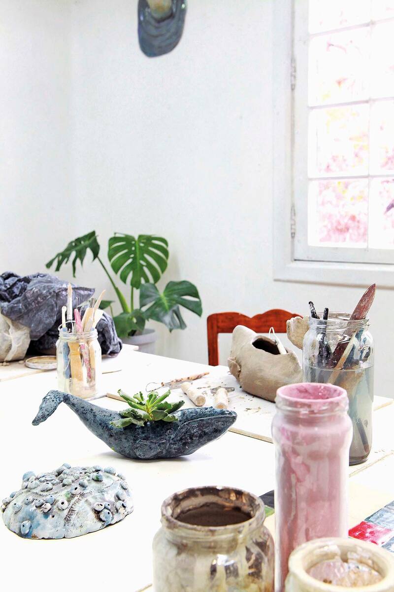 Ya no trabaja con acuarios negros, pero sigue tratando de integrar vida a su trabajo. "Estudié arte y estaba muy interesado en la escultura pero también en el color. En la cerámica encontré la manera de unir ambas cosas. Trabajo con pigmentos que se llaman bajo cubierta, que son similares a la acuarela, entonces me permiten generar tonos, texturas, superficies que son para mí más creíbles. Si bien me interesa mucho lo onírico, me atrae mucho la ilustración científica, las proporciones. Me encanta ese momento en que los ilustradores no sabían exactamente cómo eran estos mamíferos y terminaban inventando criaturas bien extrañas. Me gusta eso, exagerar algunos rasgos", dice Jordan, con una ballena en sus manos, solo esbozada, en estado cuero, el momento preciso para hacer los detalles.