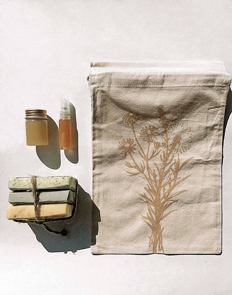 Ediciones limitadas y únicas son las que prepara @unracimo, traducidas en packs limitados que va publicando de jabones, hidrolatos de cedrón y lavanda. “Todo lo que hago es por la admiración e inspiración que me da la naturaleza; siento que hago comprimidos de ella para sentir los aromas, las texturas y sensaciones que nos da y también por el encanto de hacer las cosas por mí misma”, dice Ximena Rivas. Las bolsitas de género llevan una ilustración en serigrafía con tinta vegetal.