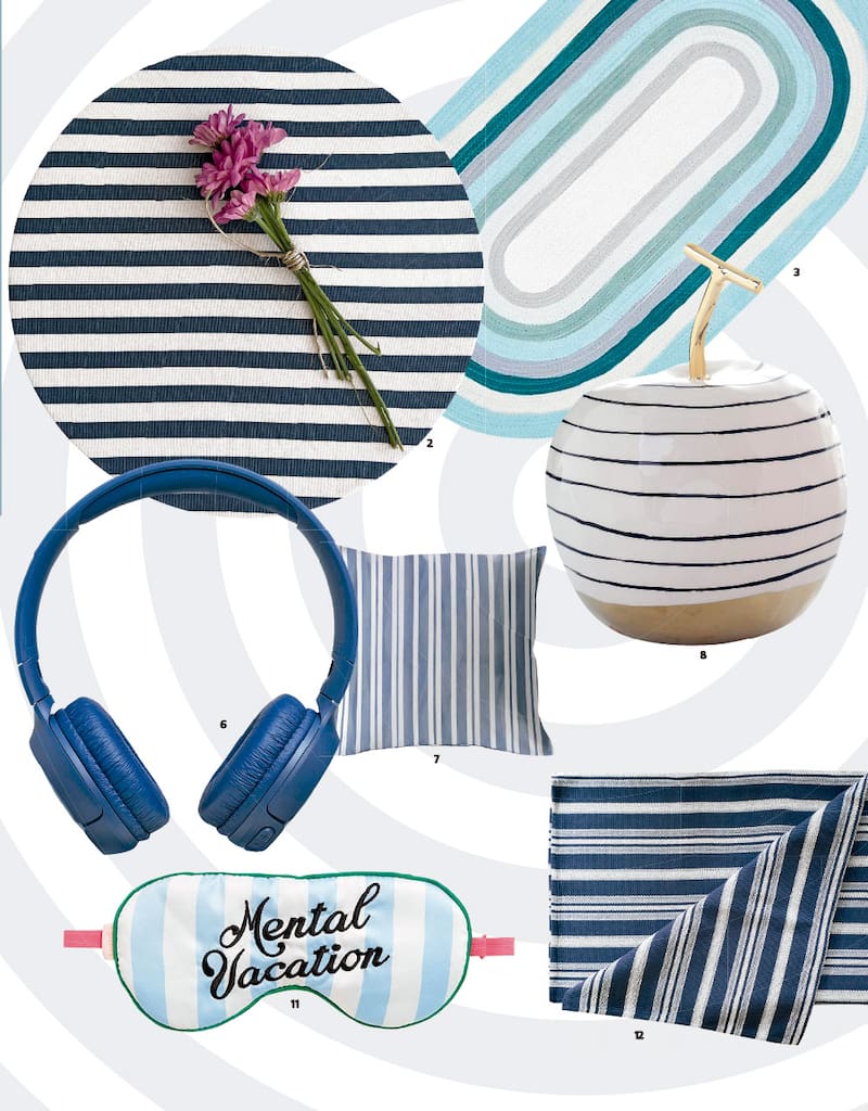 2. Set de 6 individuales, 35 cm, $36.000 (Meraki) 3. Alfombra Braided Blue, Perle & Perle, $220.000 (Falabella) 6. Audifonos On-Ear Bt Noise-Canceljbl 600Btnc, JBL, $119.990 (Falabella) 7. Funda cojín, 45 x 45 cm, Casa Alvarinho, $15.900 (Falabella) 8. Manzana Mallorca, $22.990 (Falabella) 11. Antifaz Mental Vacation, Bando, diseño de Maddy Nye, $16.990 (Depto51) 12. Alfombra, 1.70 x 2.30 cm, $69.990 (Lore Abud Deco)