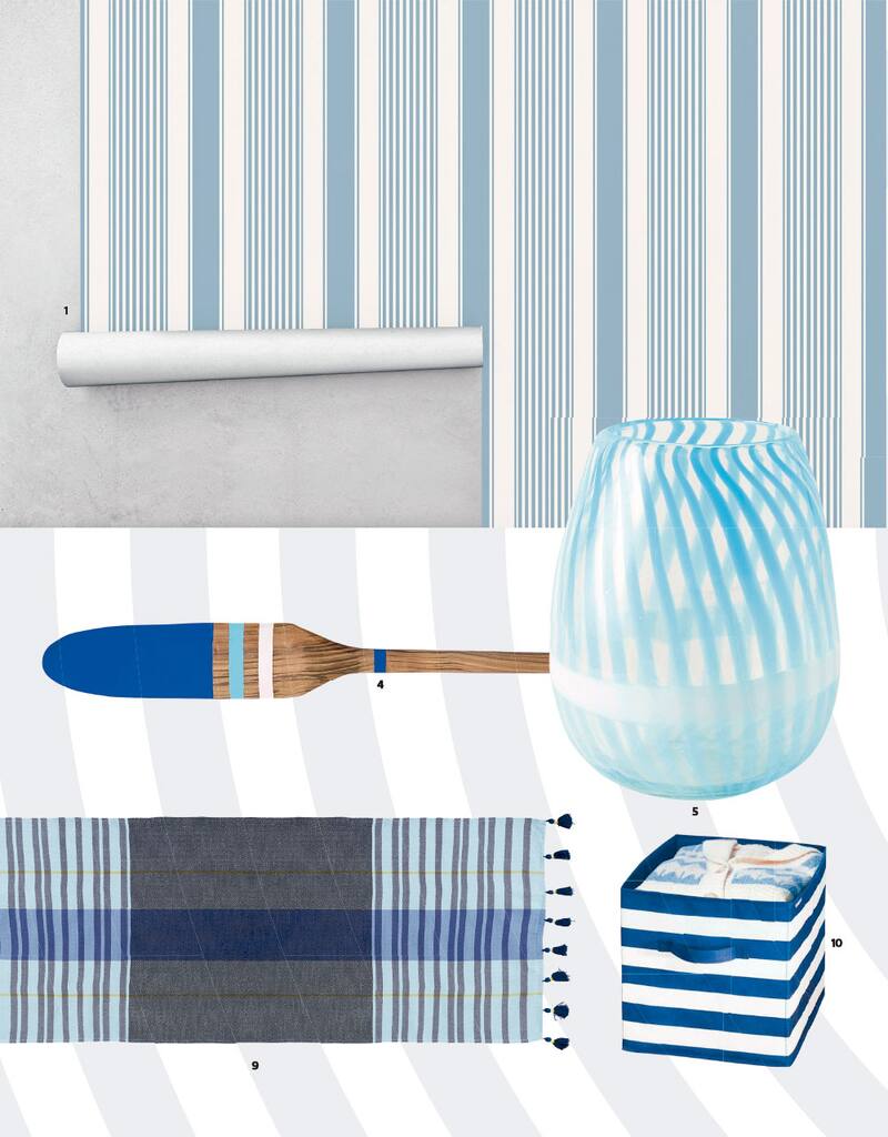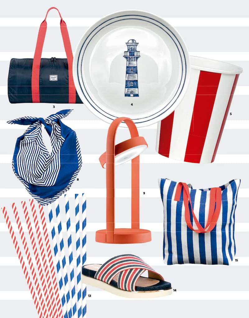3. Bolso packable Duffle Navy, Herschel, $24.990 (Falabella) 4. Set de 6 platos naúticos bajos, 25.5 cm y 6 platos de entrada, 20.5 cm, pintados a mano sobre porcelana inglesa, Wilmax, aptos para lavavajillas, $150.000 (Pintaplatos) 5. Vaso para mesas de fiesta, variedad de diseños desde $4.500 (Qué Linda es mi Fiesta) 8. Pañuelo satín, Solo Tu Spa, $9.990 (Falabella) 9. Lámpara Giravolta, Pedrali, 55 cm, $81.130 (Acero) 15. Bolsa de playa,50 x 42 cm, $6.000 (Zoki Deco) 11. Papel mural, diseños de catálogo y personalizados, $13.000 el m2 (Papelarte) 13. Set 25 bombillas de papel, $1.490 (Casaideas) 14. Sandalia Ancla, multi rayas, Azaleia, $16.990 (Dafiti)