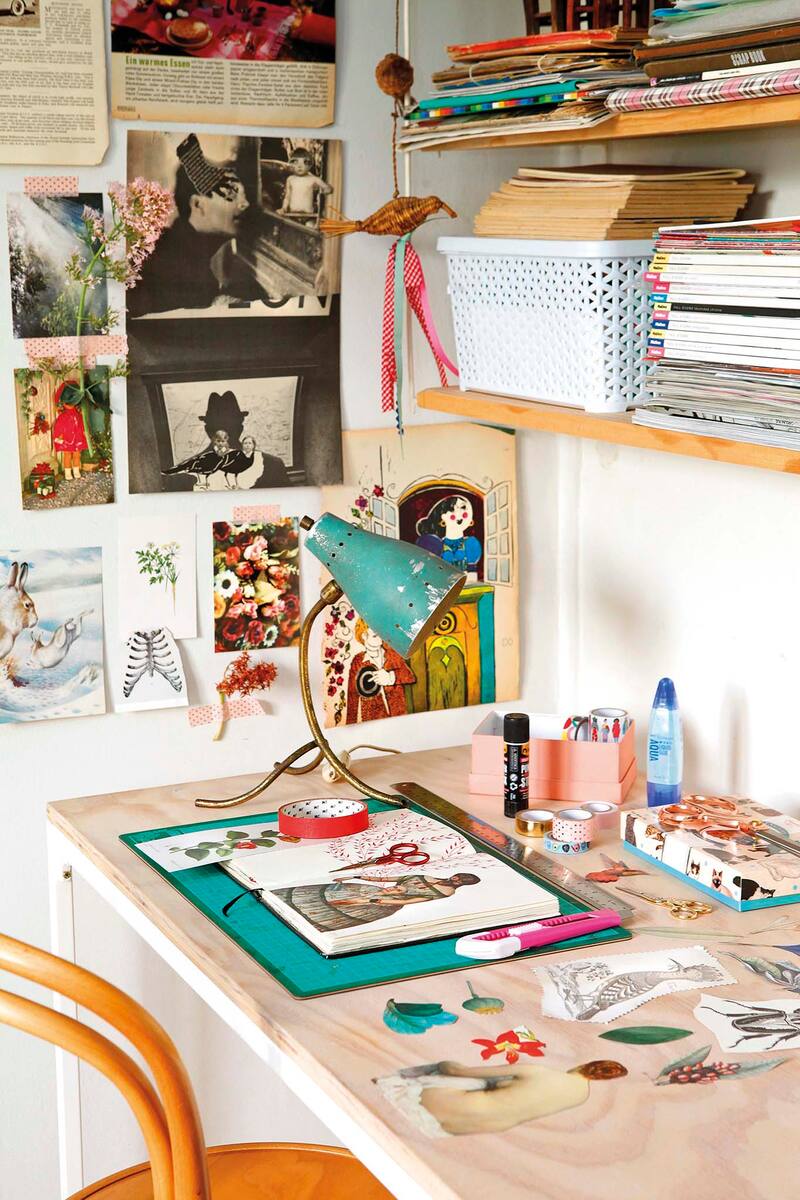 Para mí es superimportante la luz. Mi espacio de trabajo está junto a una ventana, por la que entra mucha luz. En los días nublados me muevo al comedor que recibe luz durante las tardes. Los materiales que más me gustan son las revistas y libros que contengan imágenes de plantas y flores, animales pequeños y mujeres. Muchas tijeras en diferentes tamaños y puntas, dependiendo de los recortes que voy a hacer, y un buen pegamento.