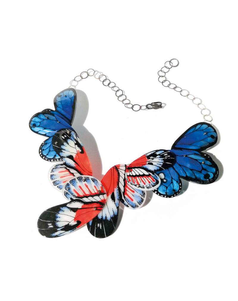 “Las mariposas son un símbolo de transformación a un estado superior. Para mí representan optimismo y superación, dos virtudes que debemos abrazar en este tiempo”, dice Vania Ruiz, diseñadora chilena detrás de la marca Casa Kiro, que subastó este collar Piano Key Wings el pasado 15 de octubre por el New York Museum of Arts and Design. La pieza está hecha en resina epóxica pintada a mano y plata, se inspiró en las alas de las mariposas “llave de piano” y “morpho”. casakiro.cl