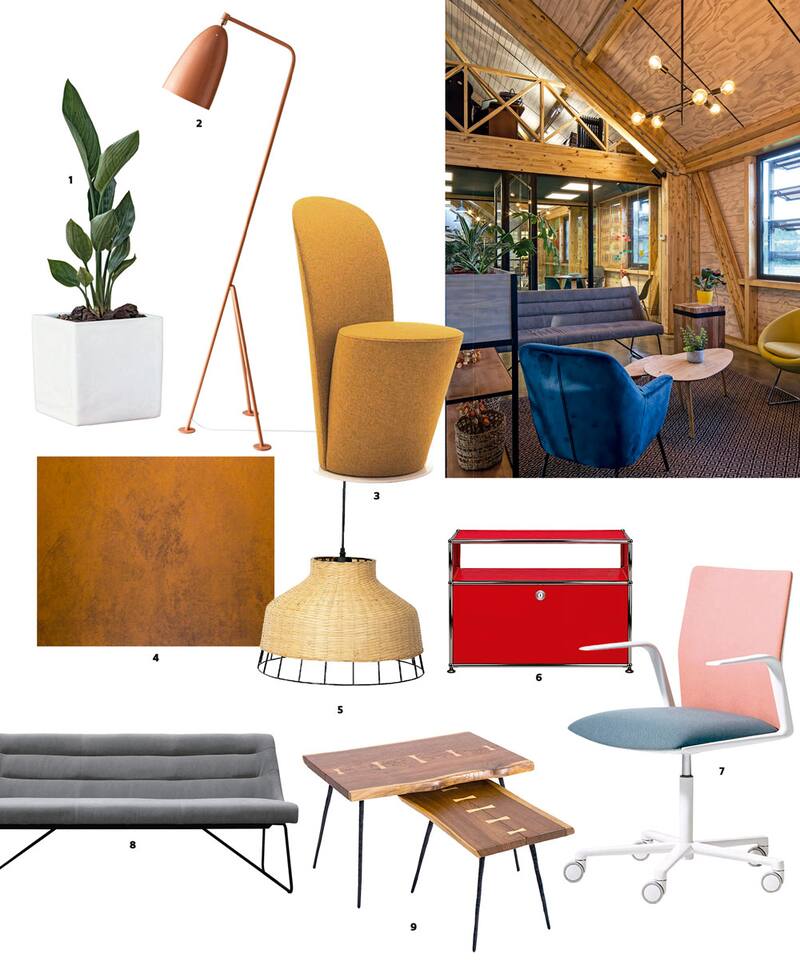 1. Strelitzia MA 1, en macetero autorregante, contiene sustrato específico y gravilla, $62.000 (@decoplantas) 2. Lámpara de pie, familia Gräshoppa, diseño de Greta M. Grossman para Gubi, consultar precio (Interdesign.cl) 3. Sillón Yesbaby, diseño de Roberto Romanello para Segis, Italia, consultar precio (fernandomayer.cl) 4. Revestimiento metálico Screenpanel en acero corten, consultar precio (hunterdouglas.cl) 5. Lámpara de cielo Alice, $45.000 (thepopulardesign.cl) 6. Mueble de almacenaje USM, diseño de Fritz Haller, consultar precio (a-cero.cl) 7. Kinesit: Diseñada por Lievore Altherr Molina, Alberto Lievore, Jeannette Altherr y Manel Molina, es la primera silla de trabajo realizada por Arper. Una propuesta minimalista que cumple con las disposiciones técnico-normativas vigentes e incorpora un mecanismo que permite movimiento sincronizado, sensible al peso, y un regulador de altura, discretamente situados bajo el asiento (@Interdesignchile) 8. Banca Sara, $349.000 (thepopulardesign.cl) 9. Mesa centro nido, Nexa Nesting, Fumed Oak, $390.000 (@tiendamilk).