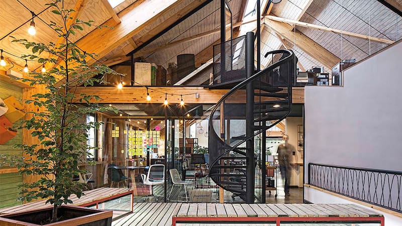 La palabra oficinas no alcanza para explicar lo que aquí se generó. Lo que se logró fue un conjunto de estares y mesas de distintas formas y alturas que ofrecen una gran diversidad para posibilitar distintas reuniones y elegir el mejor lugar para las tareas del día. “El diseño es sobrio, con muy pocos materiales bien ensamblados y soluciones constructivas que esconden las piezas de unión; es la estructura en su conjunto el único ornamento arquitectónico. Como resultado, se lograron espacios estimulantes, amplios y cálidos en contacto con la naturaleza exterior a través de las entradas de luz natural para vivir el permanente cambio que generan las nubes y las horas del día. La flexibilidad del diseño permite infinitas configuraciones en el taller de prototipos y en las oficinas; con ese criterio se diseñaron también el casino que funciona como sala de capacitación y el patio de pruebas, donde en las tardes se imparten actividades extraprogramáticas”, explica Andrés Laborde.