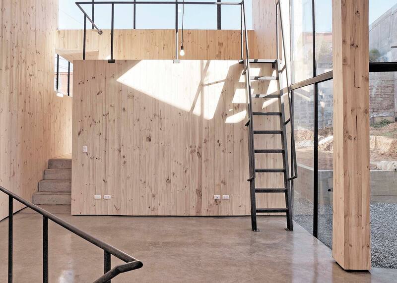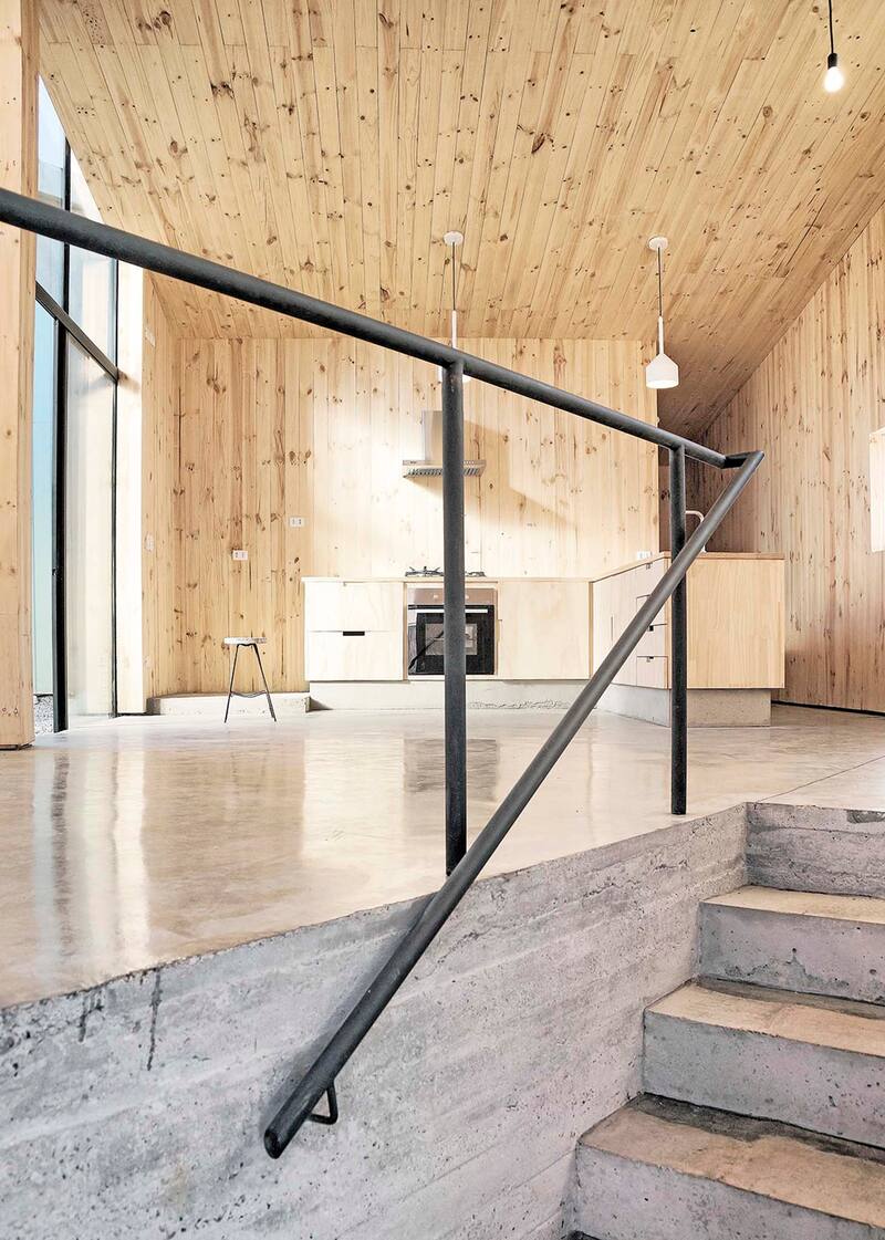 La consideración respecto a la inversión que estaba haciendo el mandante, el entender gracias a la cercanía el impacto en su patrimonio, funcionó de alguna manera como una presión positiva para Pablo y Dolores, una presión que traspasaron a los constructores. "Creemos que los materiales hay que reivindicarlos por lo que son. Es madera, es lata y es fierro. Eso obliga a la constructora a construir bien porque no puede tapar ni hermosear. Hay hormigón en las fundaciones y el radier, cimientos y suelos; después vienen todos los paneles SIP, por todo el muro perimetral y las tabiquerías inferiores; finalmente las terminaciones, la lata y la madera, tal cual. El 'lujito' está en la forma del techo, pero todavía es un sistema constructivo sencillo; había que dar un aire distinto para que la casa tuviera un carácter por la oportunidad que se nos estaba dando, para decir '¿viste?, se puede, y se puede con arquitectura'". Como un contrapunto al hermetismo de fachada, hacia el interior la casa se abre completamente. "Por una cierta cercanía con quienes iban a habitarla sabíamos lo que iba a suceder en esta casa, pero también queríamos proponer ciertos tipos de uso. El patio era la oportunidad de tener mascotas, de hacer asados familiares; ya es una ventaja muy grande para quien pasa de un departamento a una casa, pero no nos queríamos quedar en eso", recuerdan Dolores y Pablo. La casa se compone de tres dormitorios, dos baños, una bodega, una cocina abierta hacia todo el espacio de descanso y un pequeño estudio en la doble altura, justo bajo el 'jopo' que sobresale. "La planta sigue siendo de 125 m², no alcanza a ser una casa de dos pisos, pero tiene este altillo. Algo que sale de un entendimiento superconceptual se convierte en algo superestético y llamativo. Dentro de esas cosas que queríamos proponer estaba este estudio, aislado pero de alguna manera vinculado. La casa gira en torno a esta doble altura, que ordena los techos".