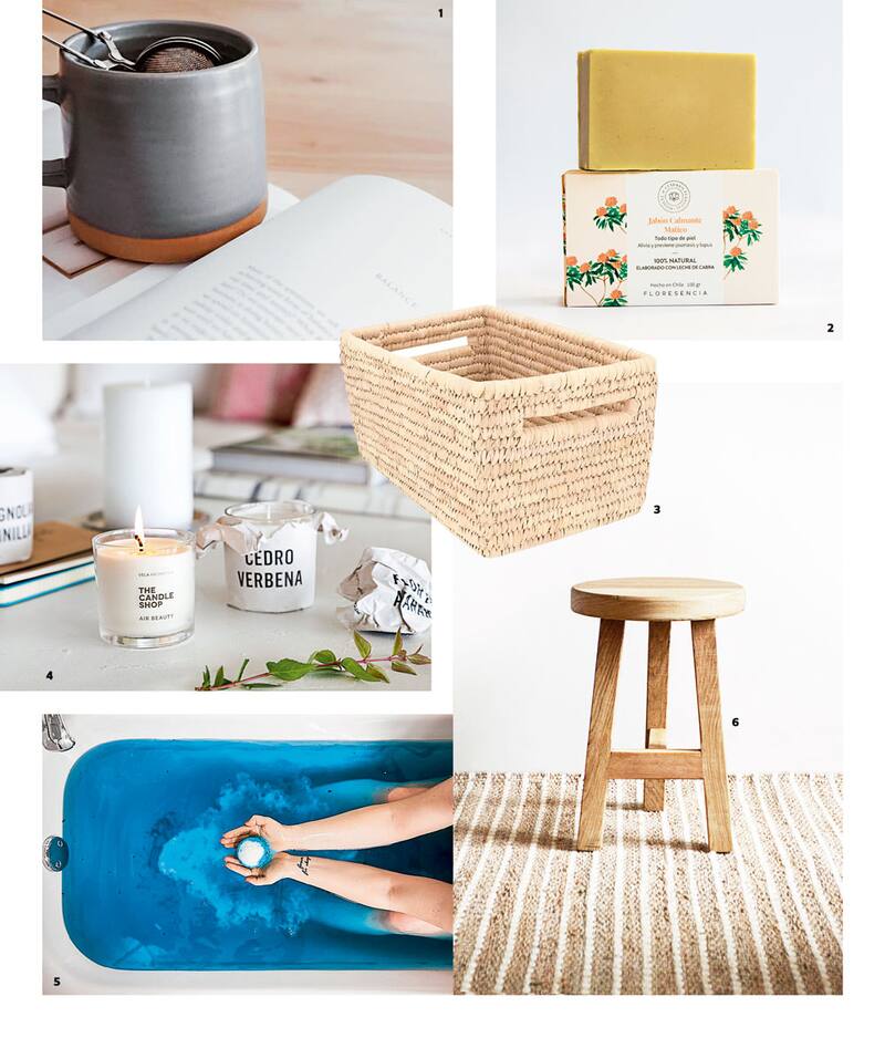 1. Tazón Olimpia, $3.500 (Olivia & Amapola) 2. Jabón calmante matico, $3.500 (Floresencia) 3. Canasto maíz, $6.990 (Casaideas) 4. Vela cozy, $9.990 (The Candle Shop) 5. Bomba de baño Big Blue, $4.700 (Lush) 6. Piso Uvilla, $60.000 (Fauno)
