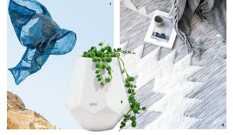 1. Pareo Santorini, algodón estampado blockprint, azul índigo, $18.990 (The BaiTay) 2. Macetero octágono con planta, $34.000 (Delrioverde) 3. Alfombra nevada, consultar precio (Milú Rugs)