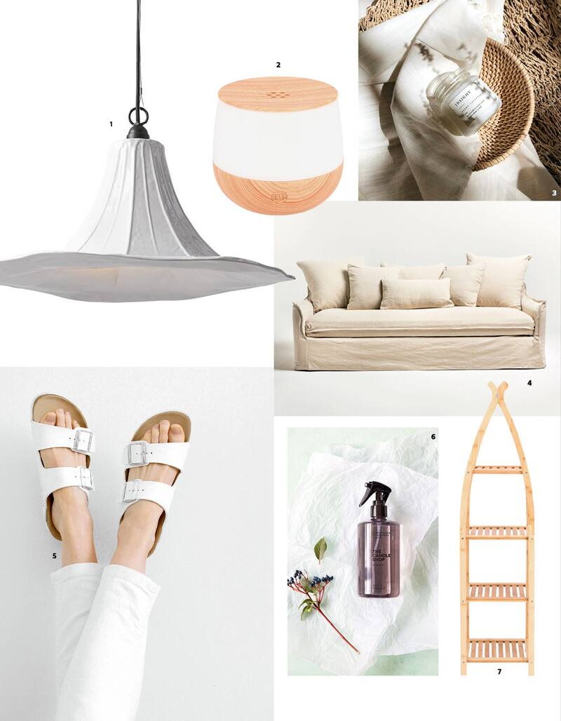 1. Lámpara copihue cielo L, $260.000 (Maia) 2. Difusor aroma USB, $13.990 (Casaideas) 3. Vela, $7.500 (Lua Villa) 4. Sofá Balum, 3 cuerpos, $890.000 (Milk) 5. Sandalias Birkenstock, Arizona, $69.990 (Rumbos) 6. Aromatizador de ambientes y textil, $12.990 (The Candle Shop) 7. Mueble MDF y madera bambú, $22.990 (Casaideas)