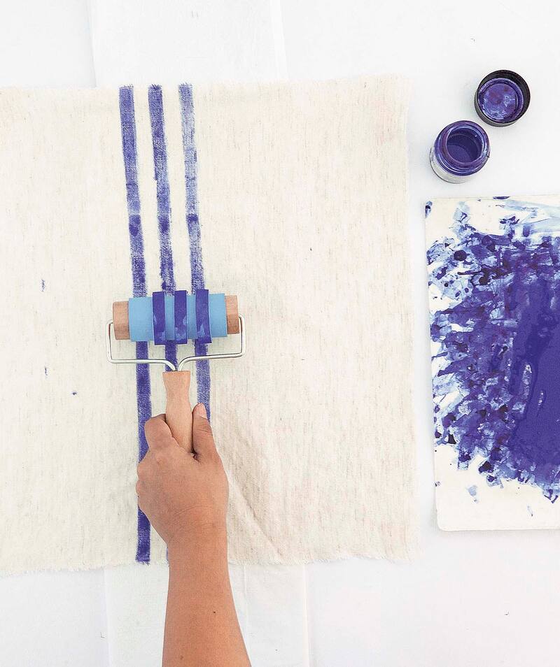 Con goma eva forra un uslero o un rodillo pequeño y corta 6 franjas de aproximadamente 1 centímetro o más, dependiendo del diseño que desees. Pega muy bien las franjas con la pistola de silicona, cuida que no se corran y que sean dobles para generar volumen. Coloca tu tela o paño con una superficie de base para que no traspase la pintura, y en otro lugar unta con pintura el rodillo. Pásalo de forma vertical y constante, sin presionar, para que no queden manchas. Lo importante es generar líneas continuas, pero ten claro que no son perfectas y que en esa imperfección está lo hermoso.