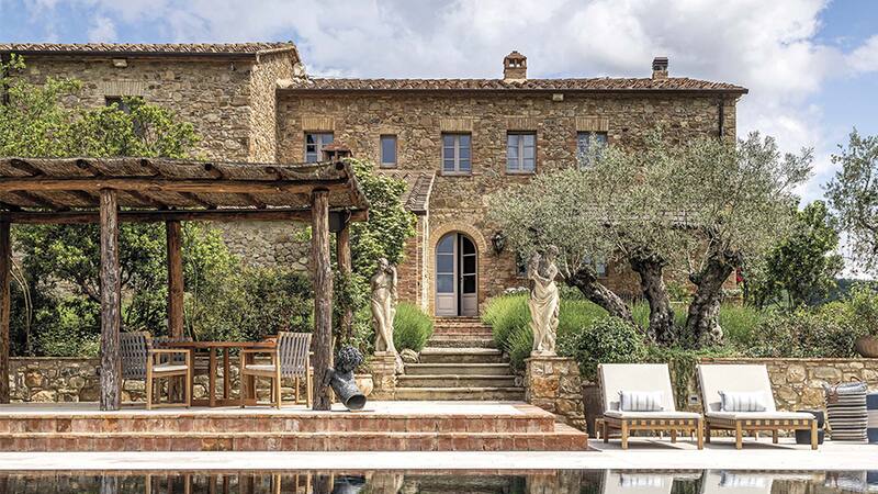 Son esos detalles los que hacen de Italia una geografía tan particular y amada. Como los suaves lomajes verdes de la Toscana, con sus fardos de paja apostados entre el paisaje y los cipreses que flanquean los caminos curvilíneos. La clásica imagen de postal, que aquí en Casole d’Elsa, un pueblito en Siena, acoge a esta casa campestre que se remonta hasta los tiempos antes de nuestra era. Durante su reconstrucción, otro detalle encantador, encontraron una columna etrusca que luego situaron en el escenográfico exterior de la casa.