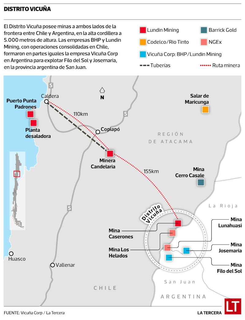 Los controladores del Distrito Vicuña son BHP y Lundin Mining, cada una con una participación del 50%. Lundin ya está presente en la zona con la mina Caserones, que forma parte del distrito y la única que ya está siendo explotada: en 2023 produjo 120 mil toneladas de cobre concentrado.