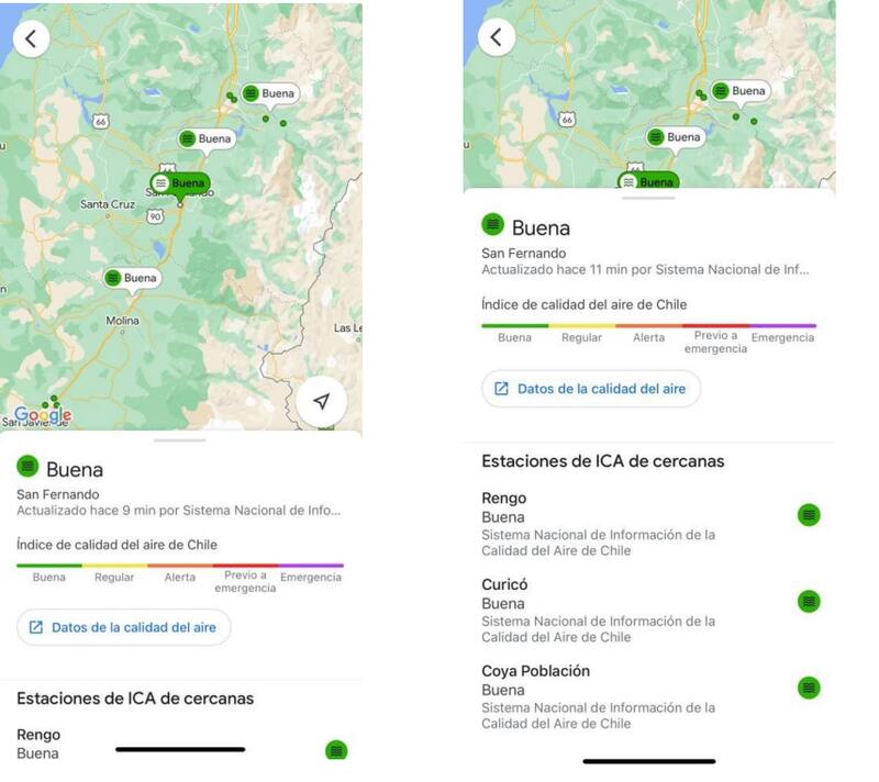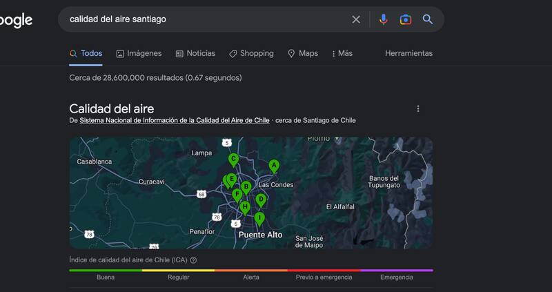 Esta función se basa en datos del Sistema de Información Nacional de Calidad del Aire (SINCA) del Ministerio del Medio Ambiente y con solo activar una capa en Maps nos permite ver pequeños indicadores en el mapa que nos indican cómo está la calidad del aire.