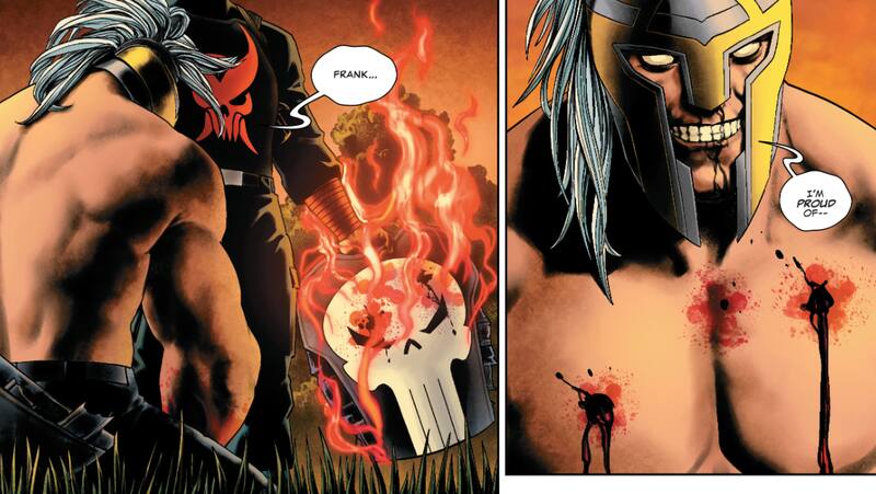Durante los últimos años Frank Castle ha experimentado varias transformaciones en los cómics de Marvel. Primero el personaje se alió con The Hand y cambió su clásico logotipo de la calavera, y posteriormente también se convirtió en el Puño de la Bestia y revivió a su esposa. Pero quizás el cambio más llamativo a la caracterización de The Punisher en el último tiempo sucedió en las páginas de Punisher #9. Después de todo en ese cómic escrito por Jason Aaron e ilustrado por Jesús Saiz y Paul Azaceta el vigilante se transformó en un dios.