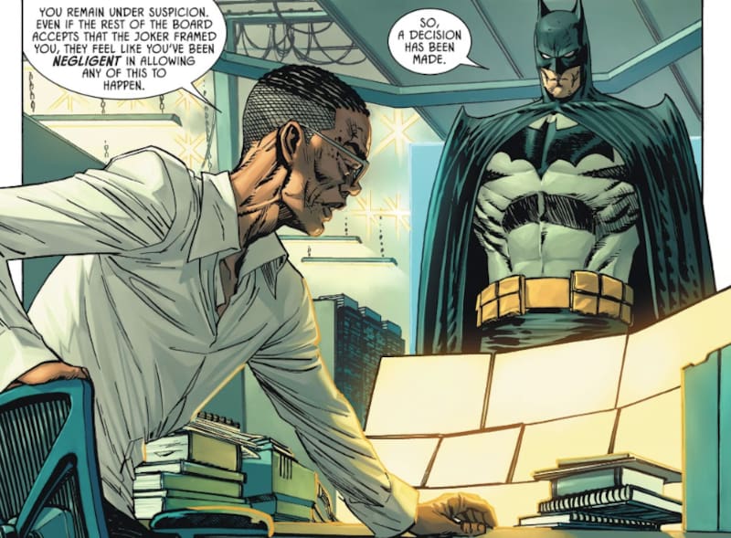En la resolución de esa historia, Catwoman envió todo el dinero a manos de Lucius Fox, quien en el más reciente cómic planteó el nuevo escenario para Batman y cómo el dinero es un gran problema para Bruce Wayne ante la supervisión que tienen sus arcas tras revelarse que usaba paraísos fiscales para esconder las operaciones que permitían utilizar el dinero para el héroe.