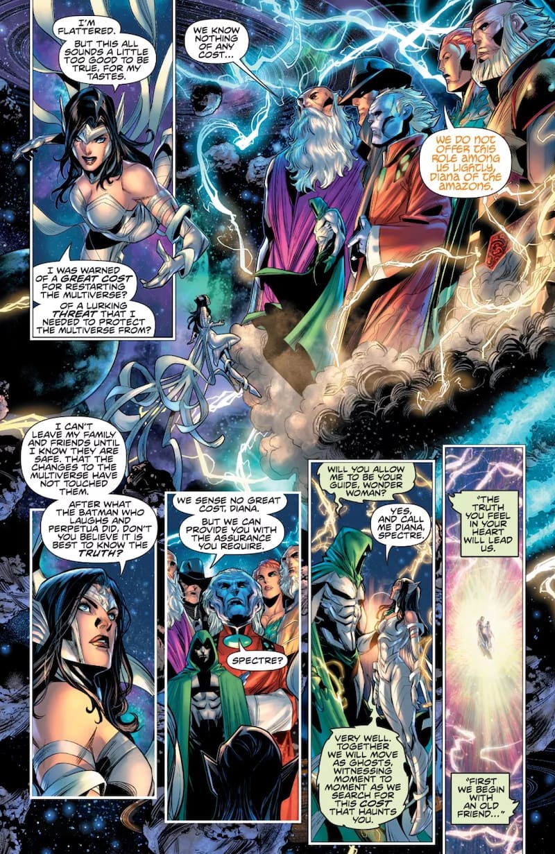 Así, aunque toda la explicación de lo que pasó con Diana se dará en el cómic, las primeras páginas de Infinite Frontier #0 que fueron reveladas por DC (vía Newsarama) anticipan que la heroína pasará a otro plano de la existencia y será invitada a sumarse a The Quintessence.