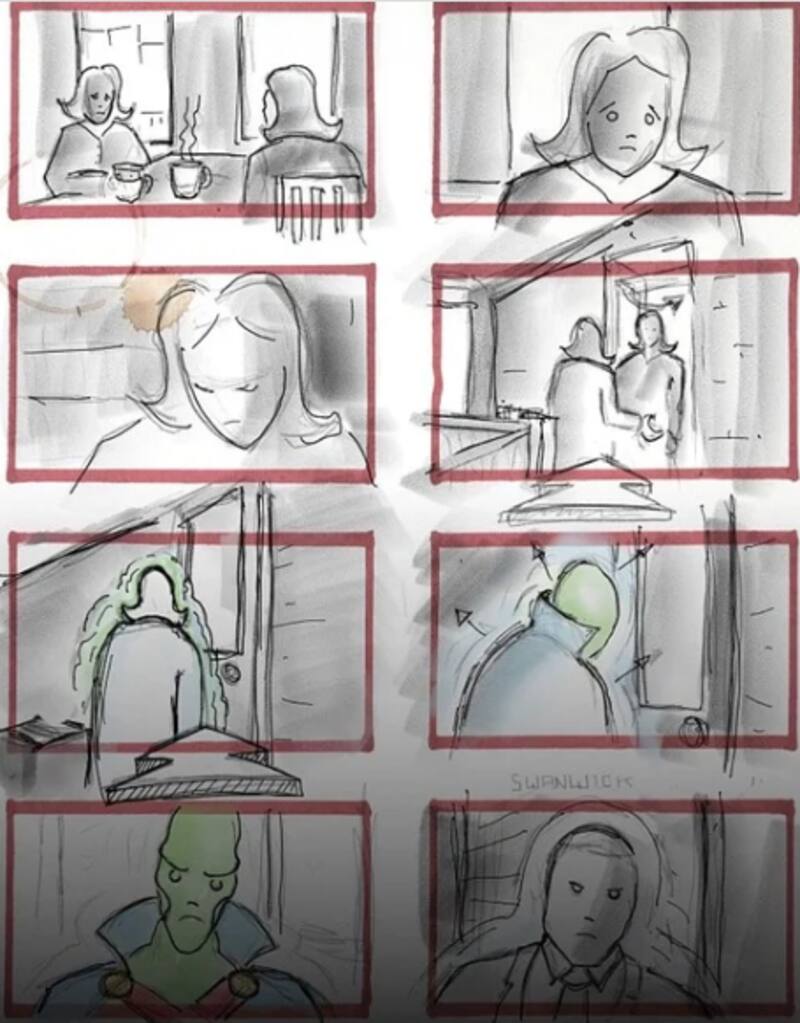 Entre las imágenes que en el pasado presentó Snyder, hubo un storyboard de una secuencia de conversación entre Lois Lane y Martha, la madre de Superman. Luego la secuencia revela que en realidad el Detective Marciano, que tiene la habilidad de cambiar de forma, era realmente quien conversaba con Lois. No solo eso, al final también se revelaba que el héroe también era Swanwick.