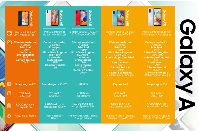 Se trata de las nuevos teléfonos inteligentes Galaxy A, que incluye a cinco modelos (A71, A51, A31, A11 y A01) y que de acuerdo a la compañía incorporan “tecnología Premium en la pantalla, cámara y batería”.