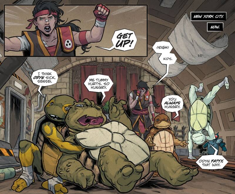 Odyn, Yi, Moja y Uno todavía son pequeños en su primera aparición formal y no les está yendo muy bien con el entrenamiento que la hija de April O’Neil y Casey Jones pretende impartir en base al libro que le dejó Michelangelo. No obstante, la promesa es que crecerán a medida que avanzan los números de Teenage Mutant Ninja Turtles: The Last Ronin- The Lost Years #1.