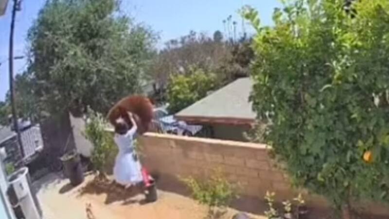 Las acciones de la joven identificada como Hailey Morinico fueron registradas por una cámara de seguridad donde se puede apreciar cómo un oso y dos oseznos están sobre el muro de una casa cuando repentinamente llegan los perros de esa propiedad.