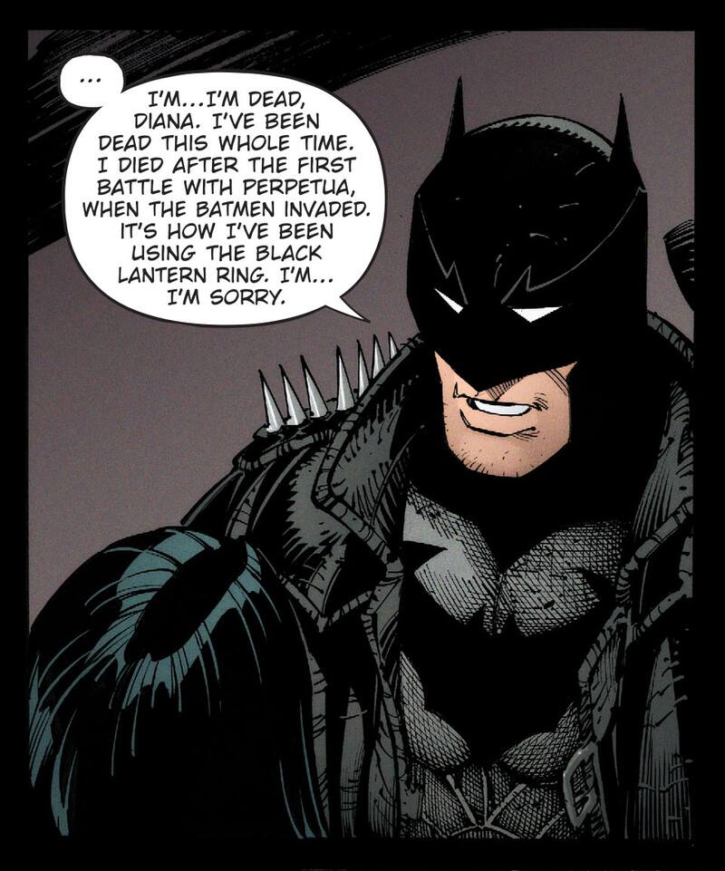 Batman por su parte comenzó admitiendo que había muerto tras la primera batalla con Prepetua, lo que explica por qué ha podido usar un anillo de Linterna Negra todo este tiempo, por qué ha sobrevivido ataques mortales, y por que el Batman que Ríe no lo estaba buscando al inicio del evento.