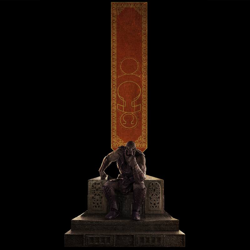 Darkseid, por su parte, mide 59,28 cm sentado en su trono de piedra, incluye un estandarte de 1 m que puede desplegarse por detrás y sus ojos se iluminan con una luz LED.