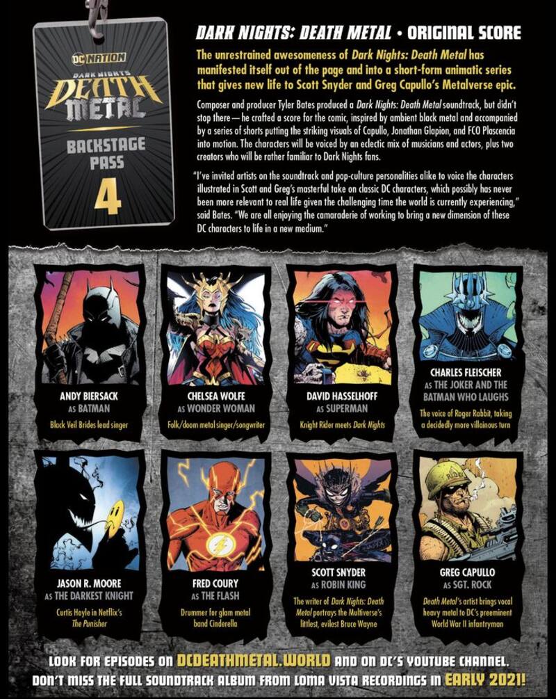 Esos cortos aún no tienen una fecha concreta de lanzamiento, pero CBR notó que la compañía presentó oficialmente al elenco de esa apuesta en una página al final de Dark Nights: Death Metal #4, el número más reciente del evento que fue publicado este martes.