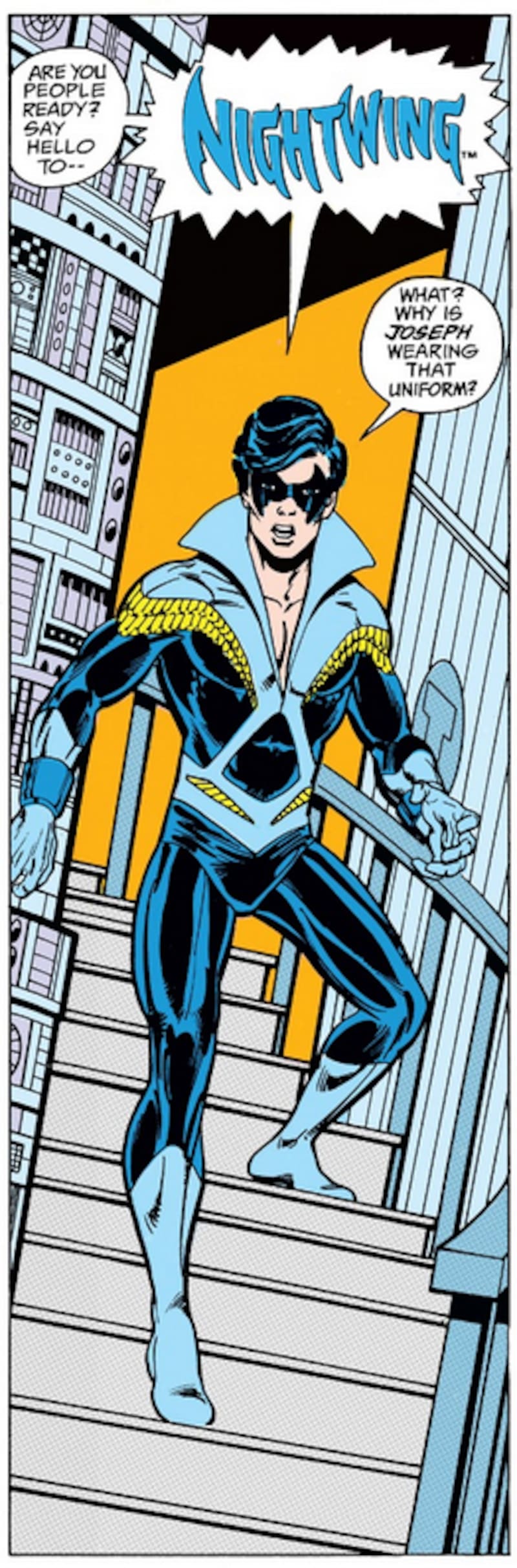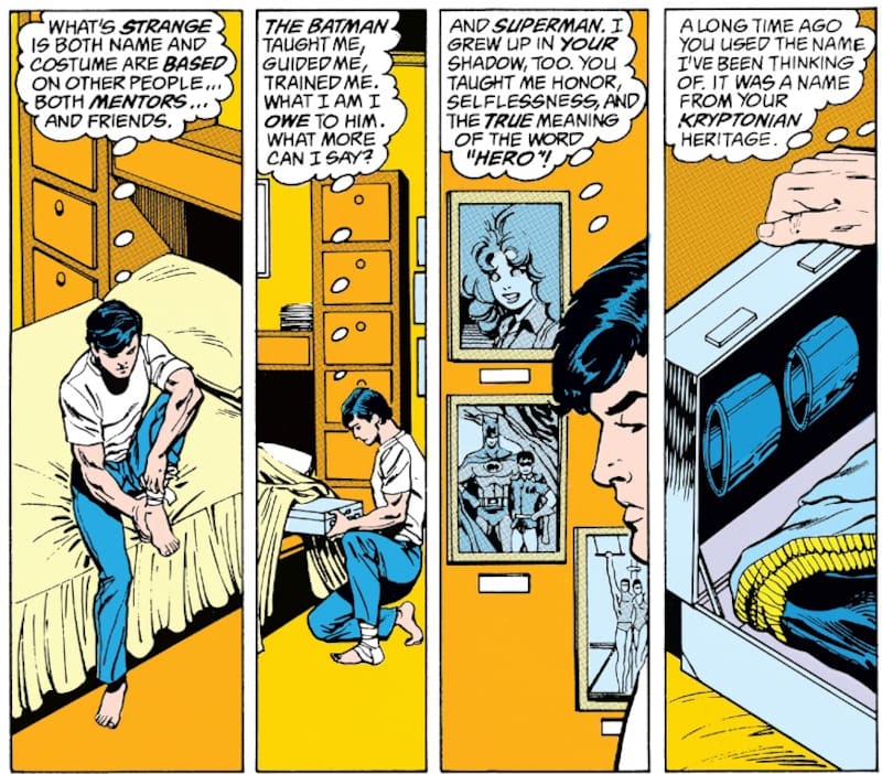 Lo anterior se lleva a cabo en el histórico Tales of the Teen Titans #44, publicado en 1984 y parte de la saga de “El Contrato de Judas”. En ese número, Dick toma su nueva identidad superhéroica como homenaje a sus padres, Superman y el propio Batman.