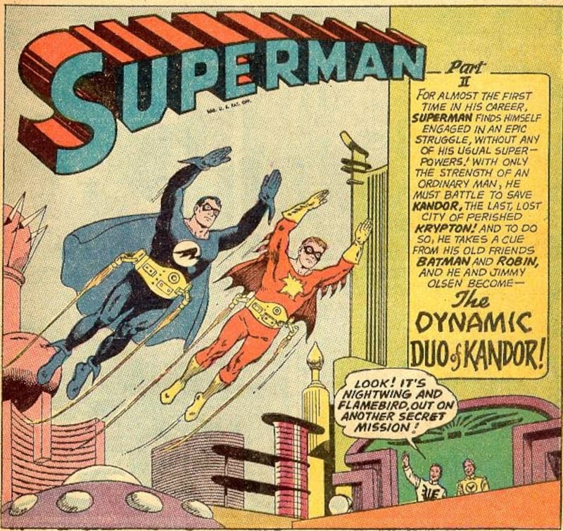 Como en ese lugar el hombre de acero no tenía poderes, el superhéroe asumía una identidad de vigilante inspirada en Batman y Robin. En ese sentido, y adoptando los nombres de un par de aves kandorianas, Superman se hace llamar Nightwing mientras que Jimmy Olsen pasa a ser conocido como Flamebird.