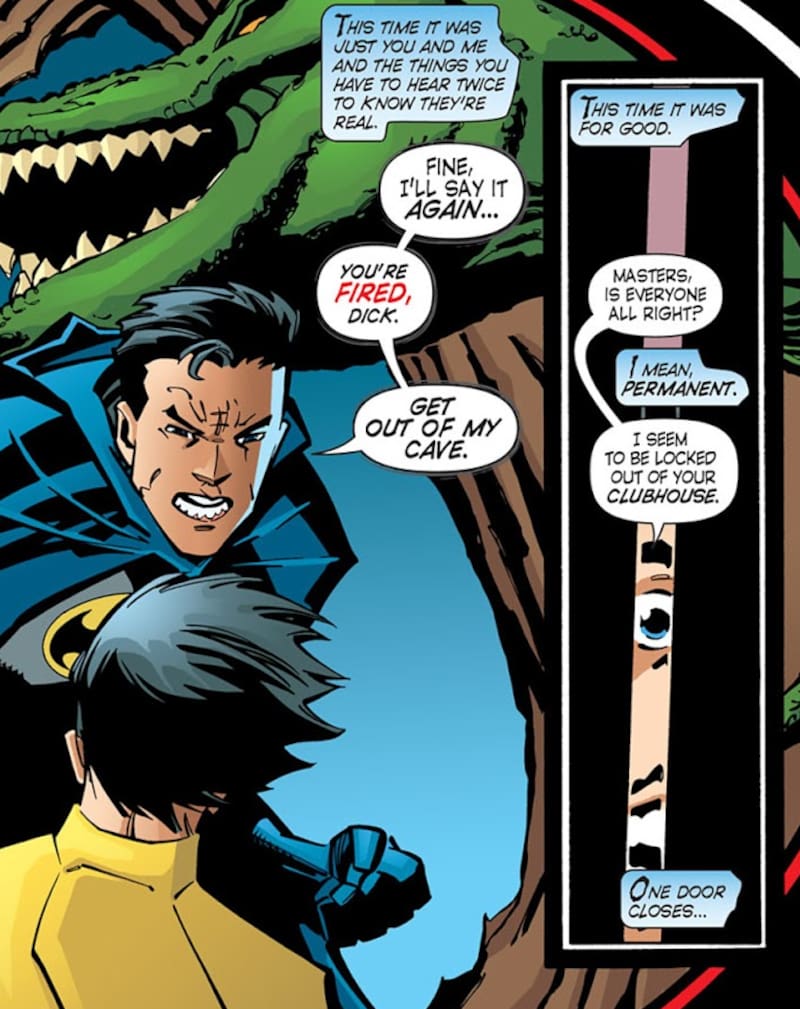 Al mismo tiempo, si bien en la continuidad antigua hubo un distanciamiento entre Batman y Robin debido a los compromisos con los Teen Titans, el reinicio posteriormente terminó gestando la idea de que Dick fue despedido por Bruce luego de que el Joker le dispara en los sucesos del cómic Batman #408. En ese sentido, y a partir de una historia de “Año Uno” publicada en Nightwing #101 durante la década de los noventas, se creó el retcon para que el joven héroe decidiese seguir sus aventuras con su nueva identidad.