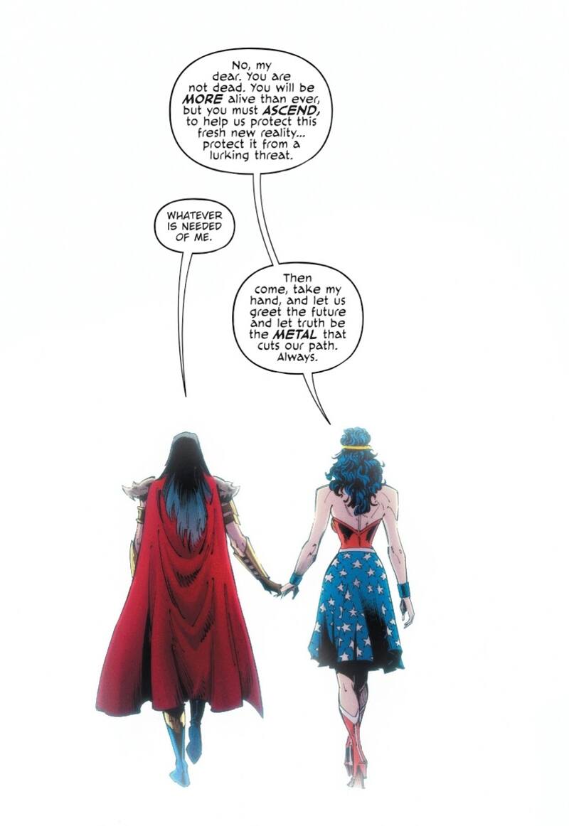 Obviamente eso suena como que Diana no está en el mundo de los vivos, y claramente el nuevo atuendo de la heroína y sus conversaciones con el Espectro tampoco apuntan en esa dirección.
