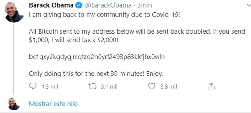 Pero el alcance de los hackeos no se quedó solo en los inicialmente reportados, ya que inclusive la cuenta del ex Presidente de los Estados Unidos, Barack Obama, publicó el mensaje.